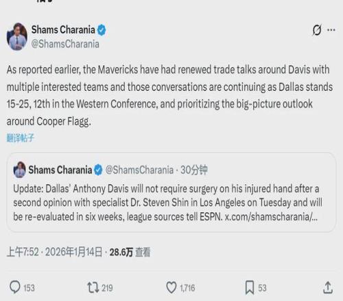 在今天早些时候,小牛方面收到坏消息,NBA知名记者Shams透露,浓眉很可能(is likely to)需要接受左手韧带修复手术。